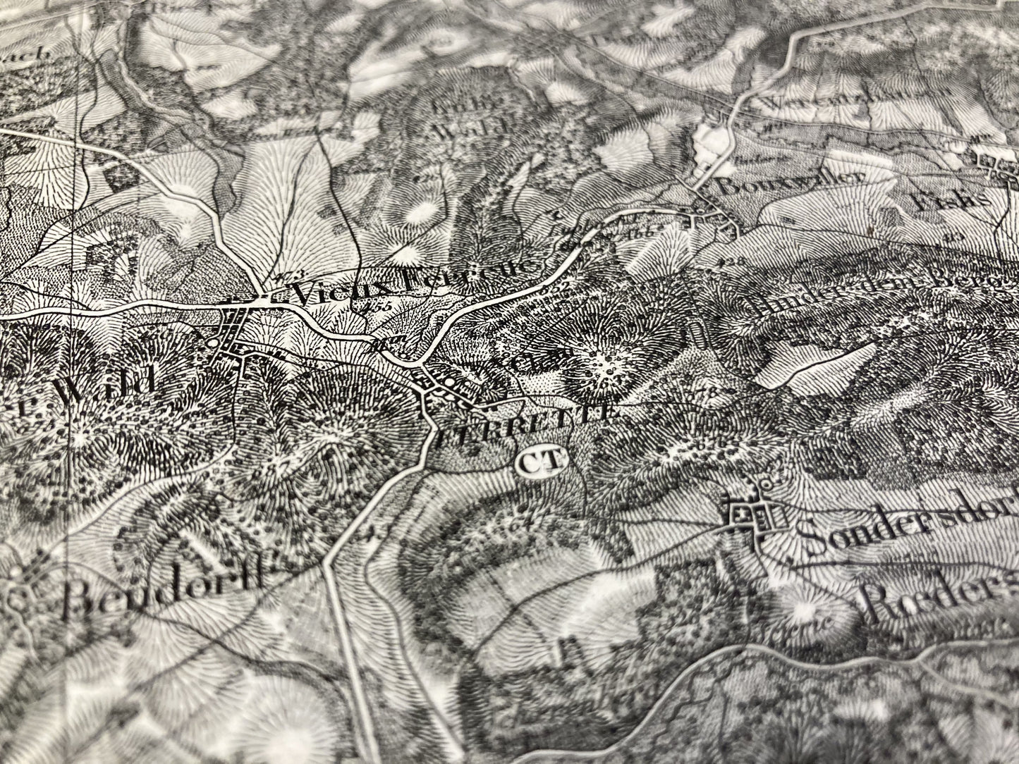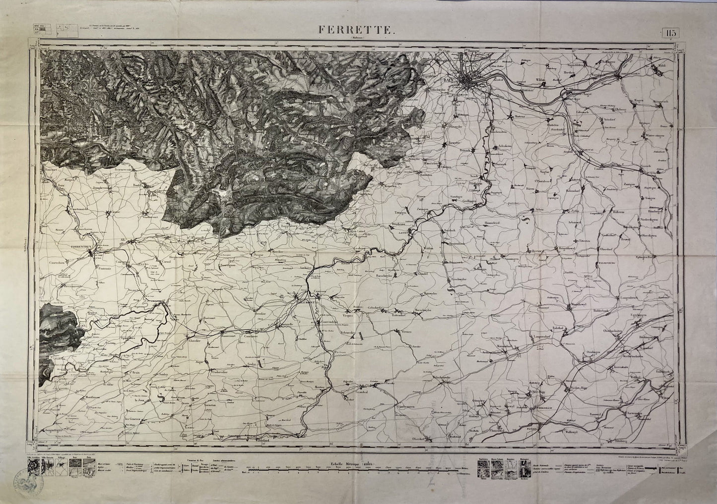 Cette carte d'État-Major intitulée "Ferrette" (N°115) a été imprimée par Lermercier et Cie à la fin du XIXe siècle sur un papier fin d'une dimension de 89,5x63cm. Il est indiqué au dos qu'elle a appartenu au Capitaine-Commandant du Régiment d'Artillerie Divisionnaire de Bourges.