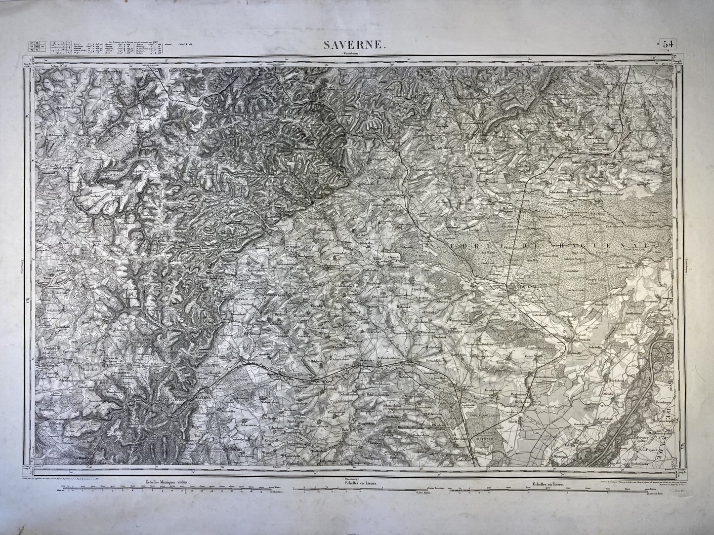 Cette carte d'État-Major intitulée "Saverne" (N°54) a été imprimée par le Dépôt de la Guerre avant 1887 sur un papier épais d'une dimension de 100x67,5cm.