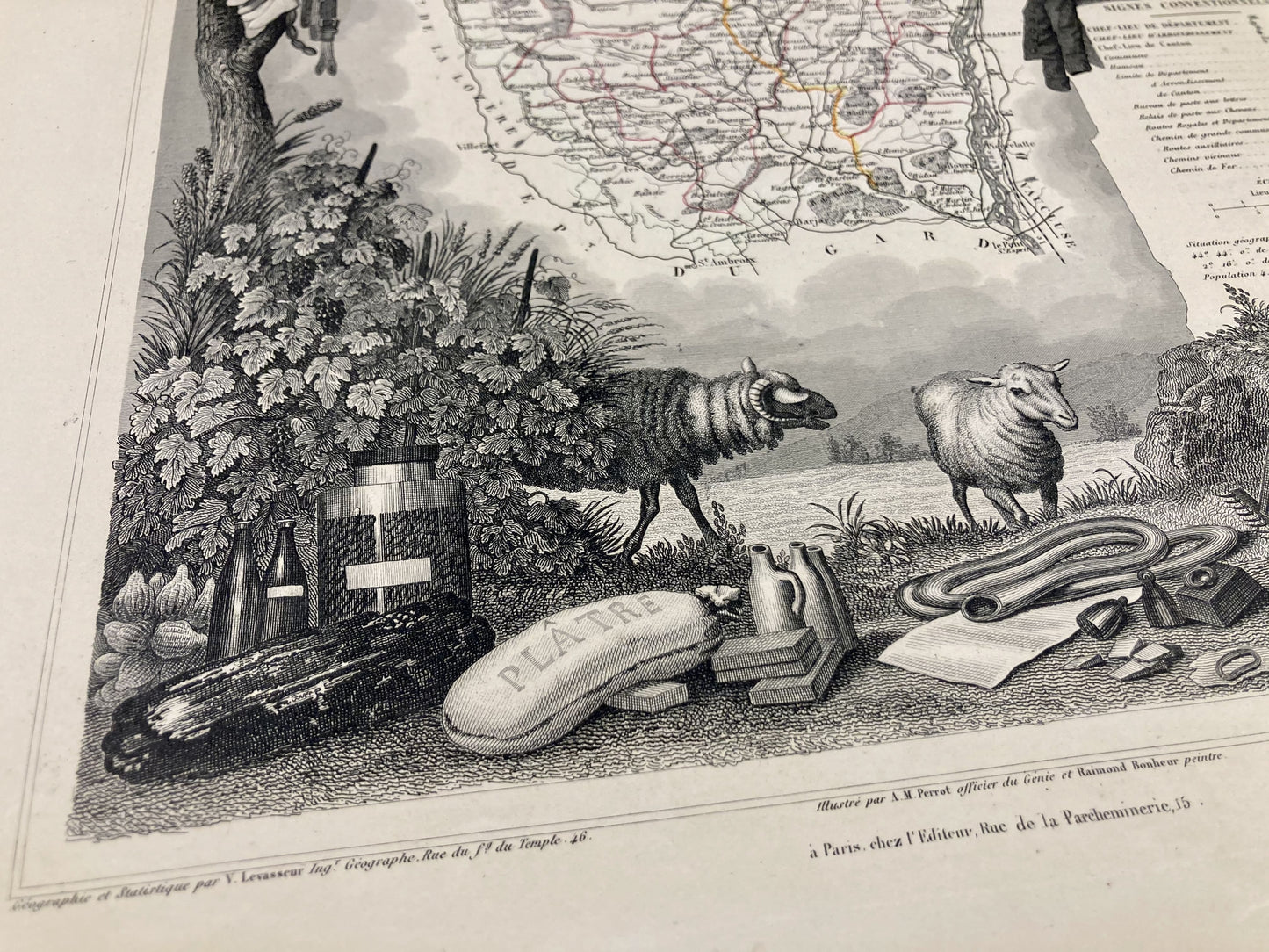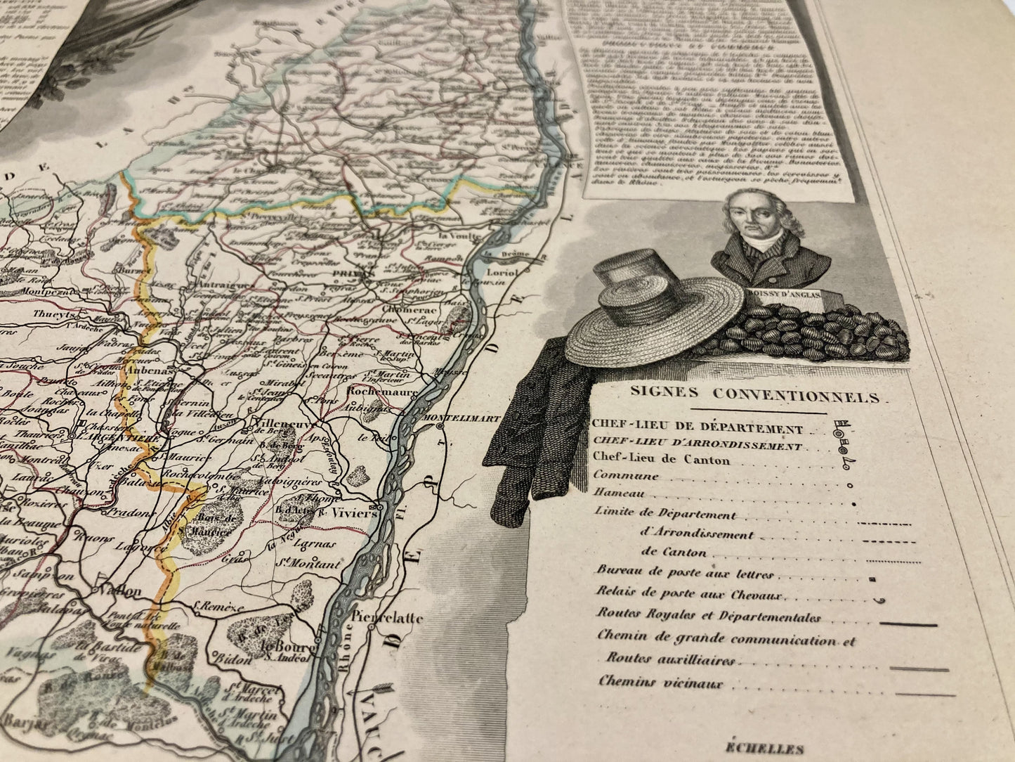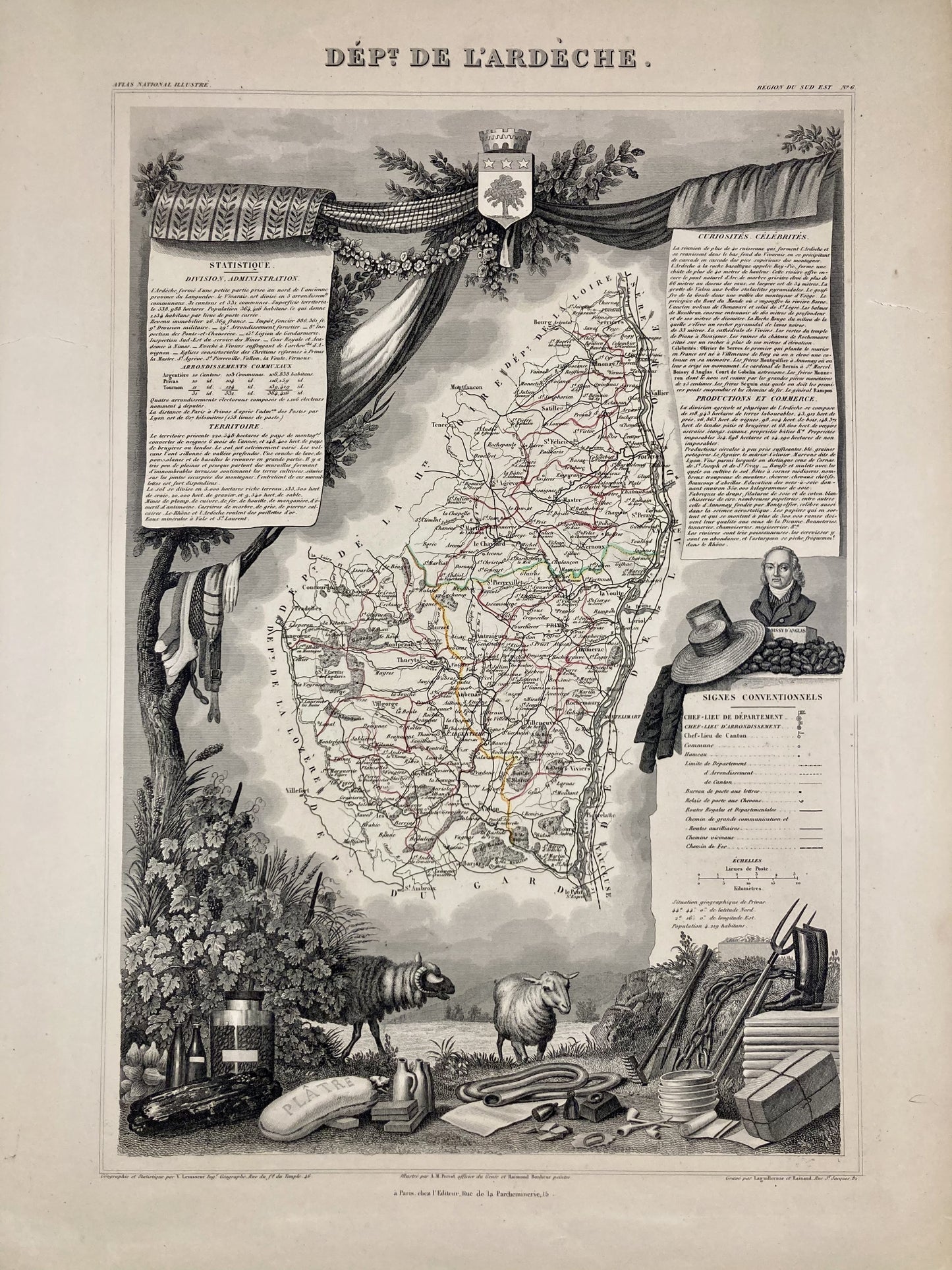 Cette carte ancienne de l'Ardèche est ornée d'illustrations représentant ses spécialités et quelques informations statistiques, historiques et économiques. Elle est issue de l'Atlas National Illustré et a été réalisée par le Géographe Victor Levasseur entre 1842 et 1872. Sa dimension est de 53x36cm (à 2cm près). On retrouve sur cette carte les villes et villages de l'Ardèche de l'époque.