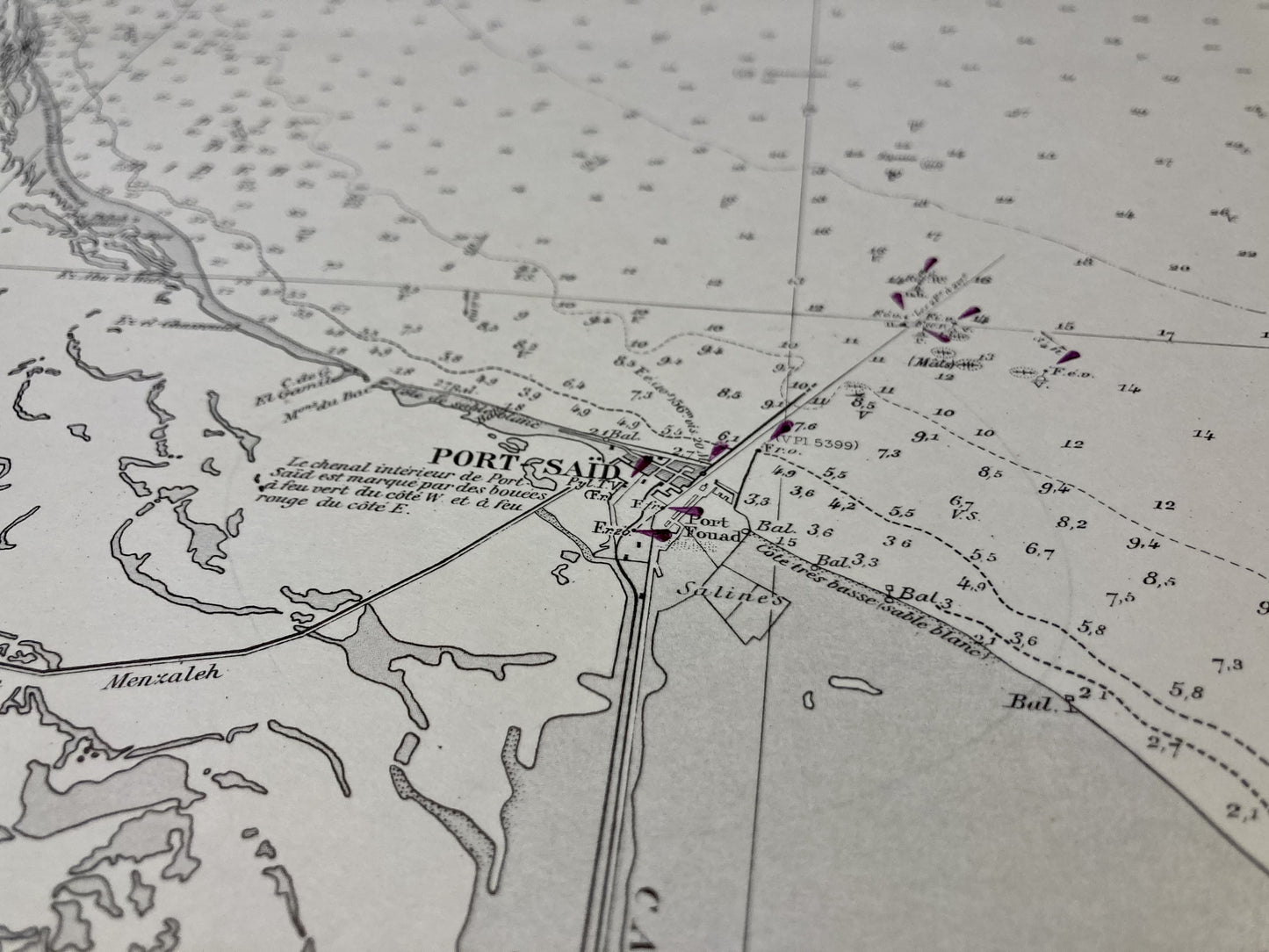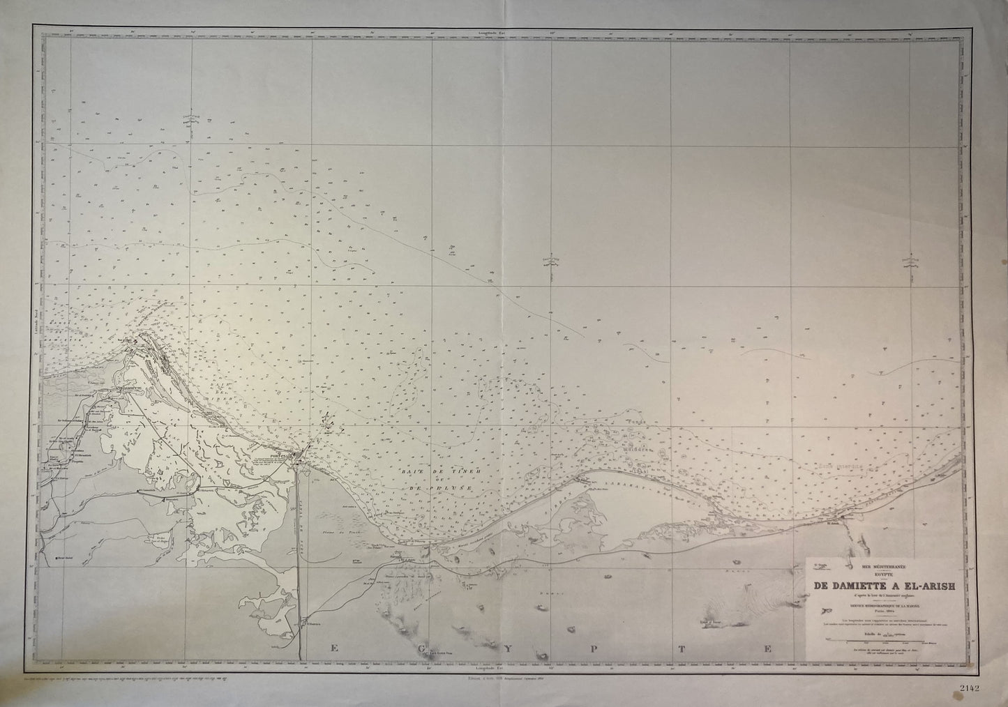 Cette carte marine ancienne représentant la côte égyptienne, de Damiette à El-Arish, a été réalisée par le Service Hydrographique de la Marine, ancêtre du SHOM. Sa dimension est de 105x74cm.