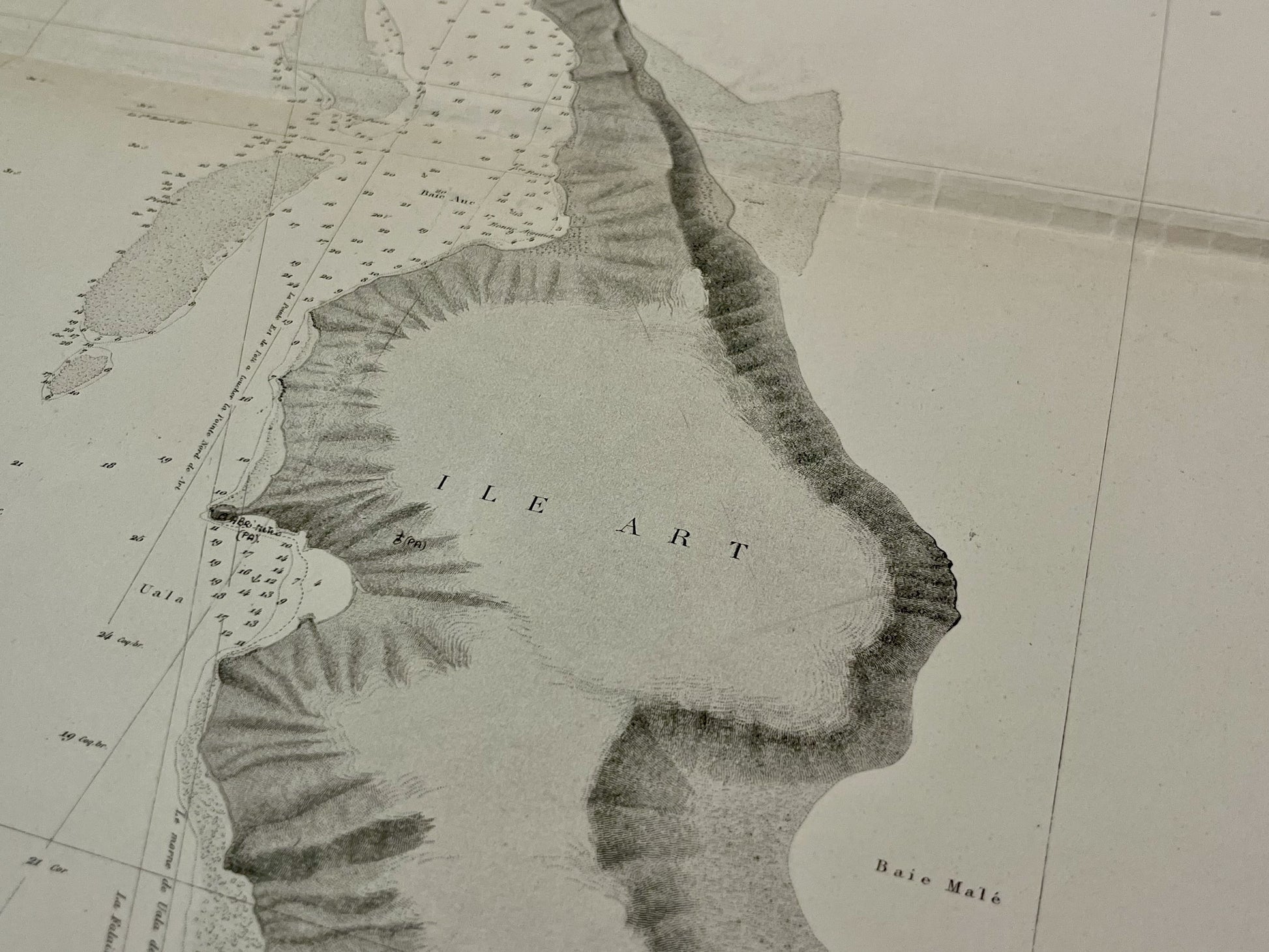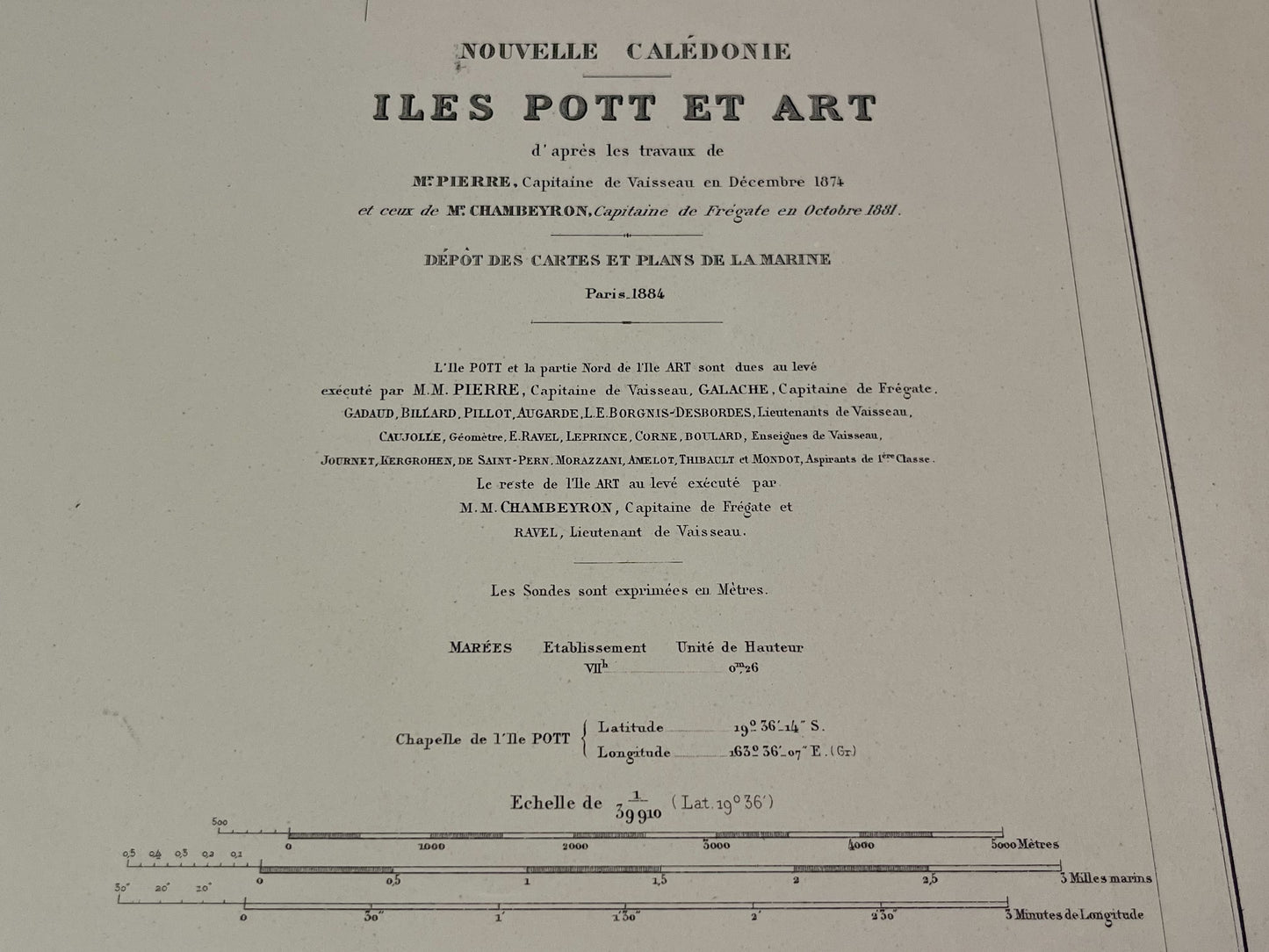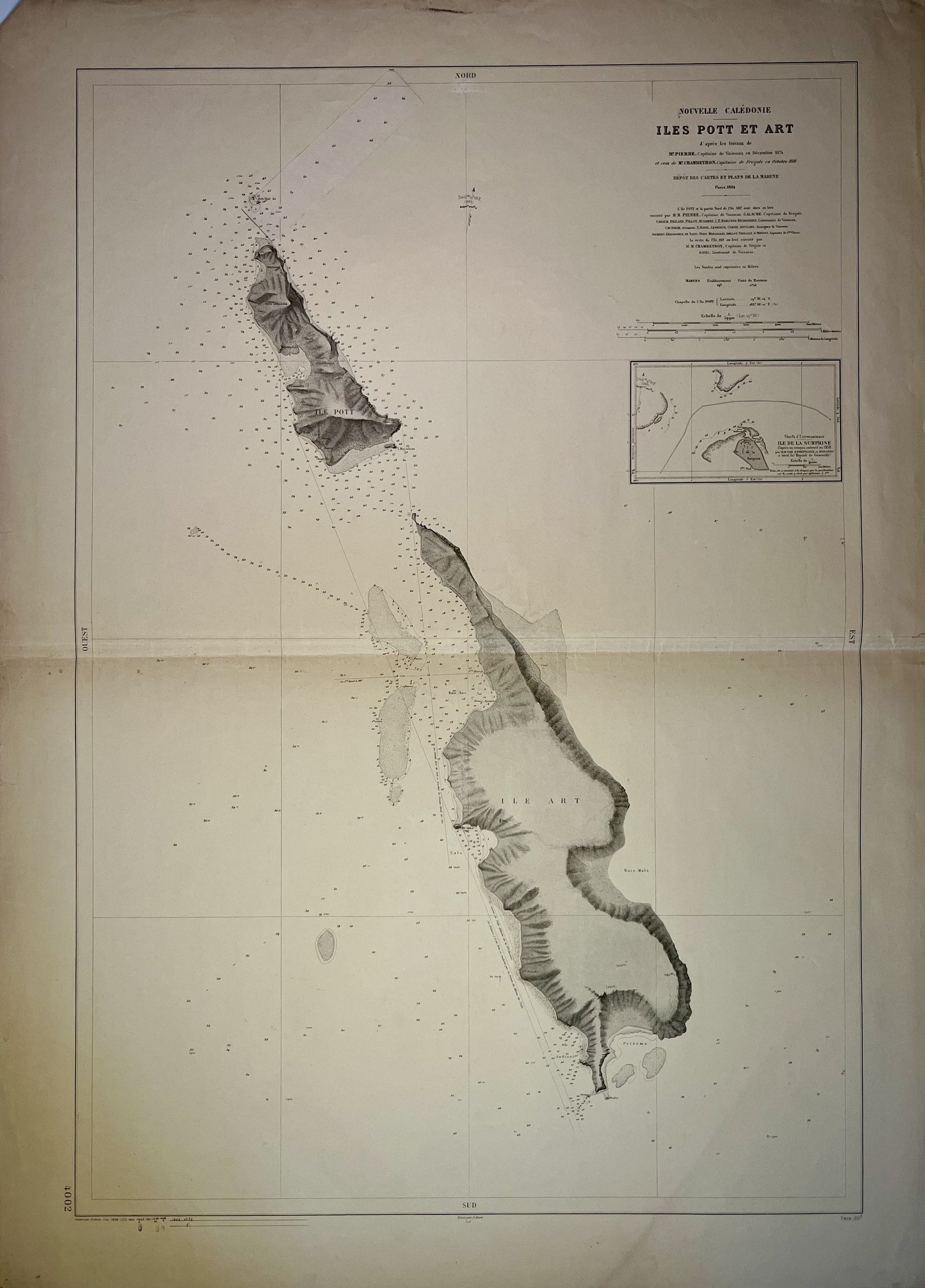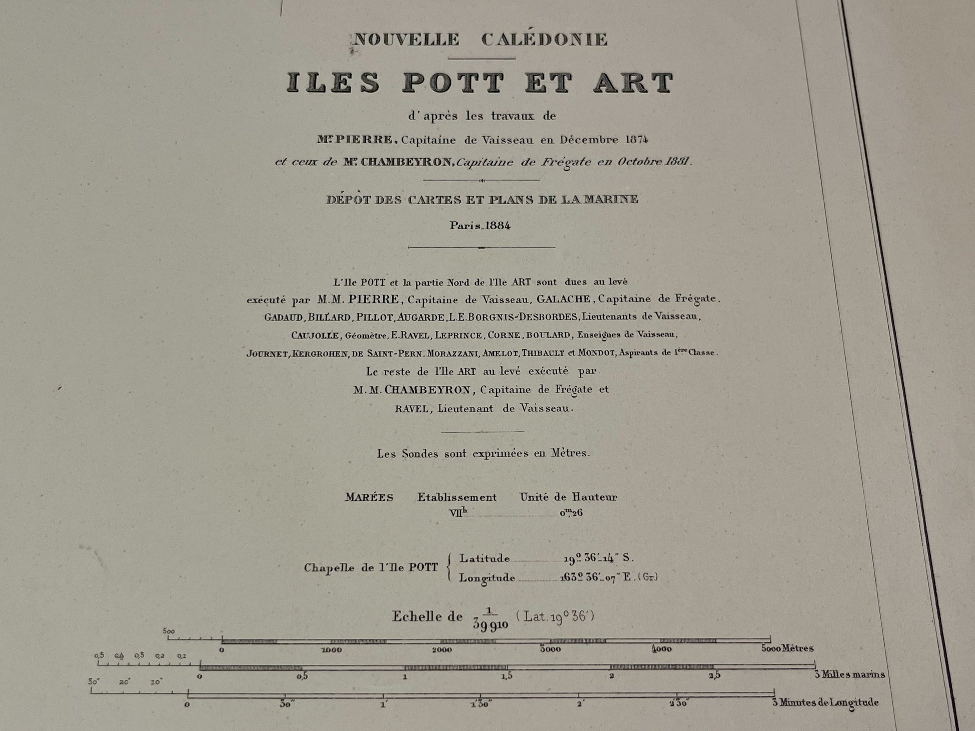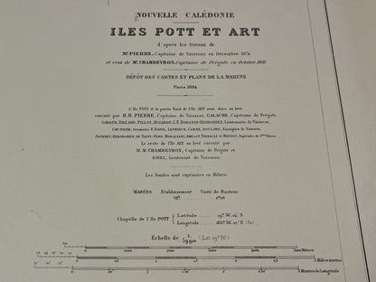 Cette carte marine ancienne des Îles Pott et Art en Nouvelle-Calédonie, a été réalisée par le Dépôt des Cartes et Plans de la Marine. Elle date du milieu du XXe siècle et sa dimension est de 104,5x75,5cm.