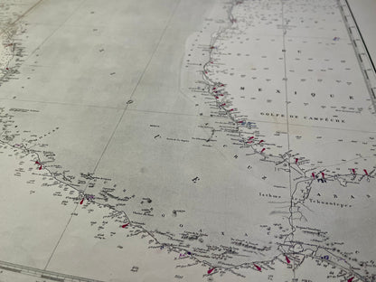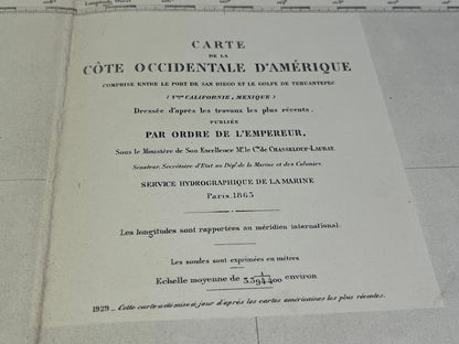 Cette carte marine ancienne de la Côte Occidentale d'Amérique comprise entre le Port de San Diego et le Golfe de Tehuantepec, a été réalisée par le Service Hydrographique de la Marine, ancêtre du SHOM. Elle date du milieu du XXe siècle et sa dimension est de 106x75cm.
