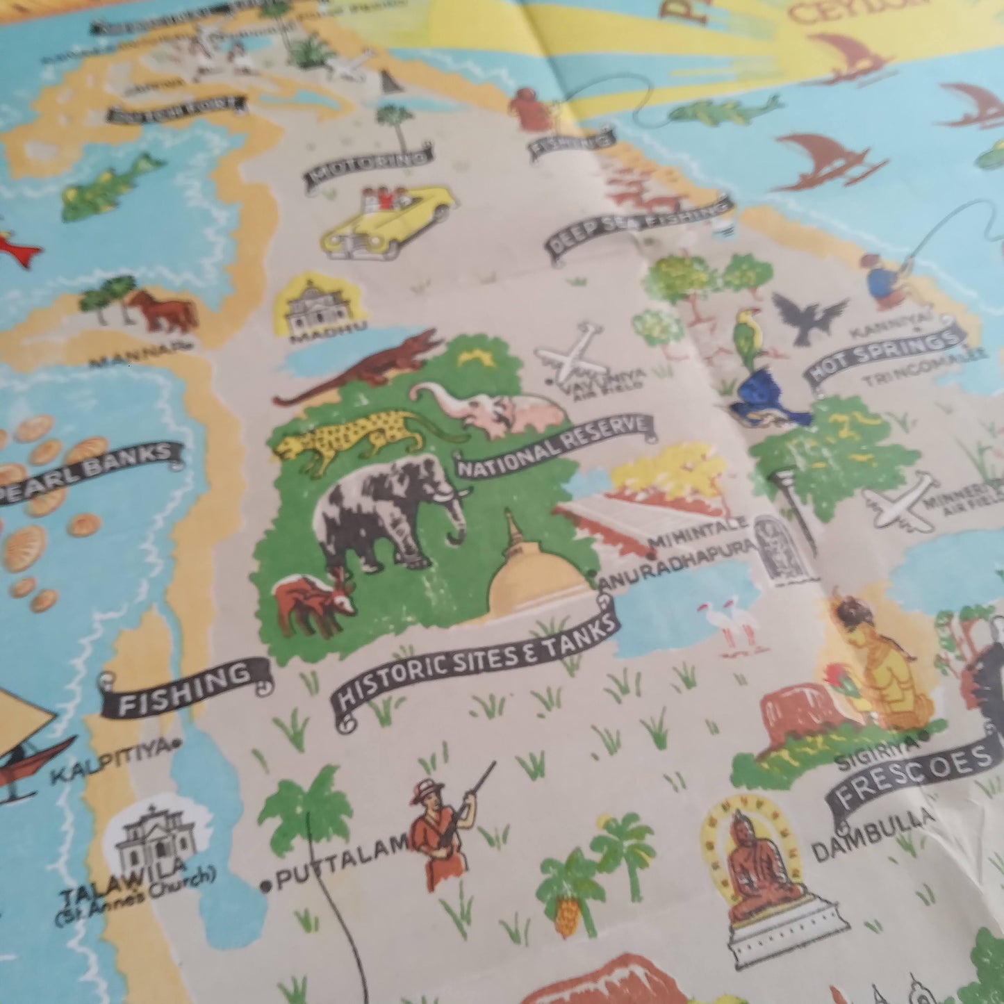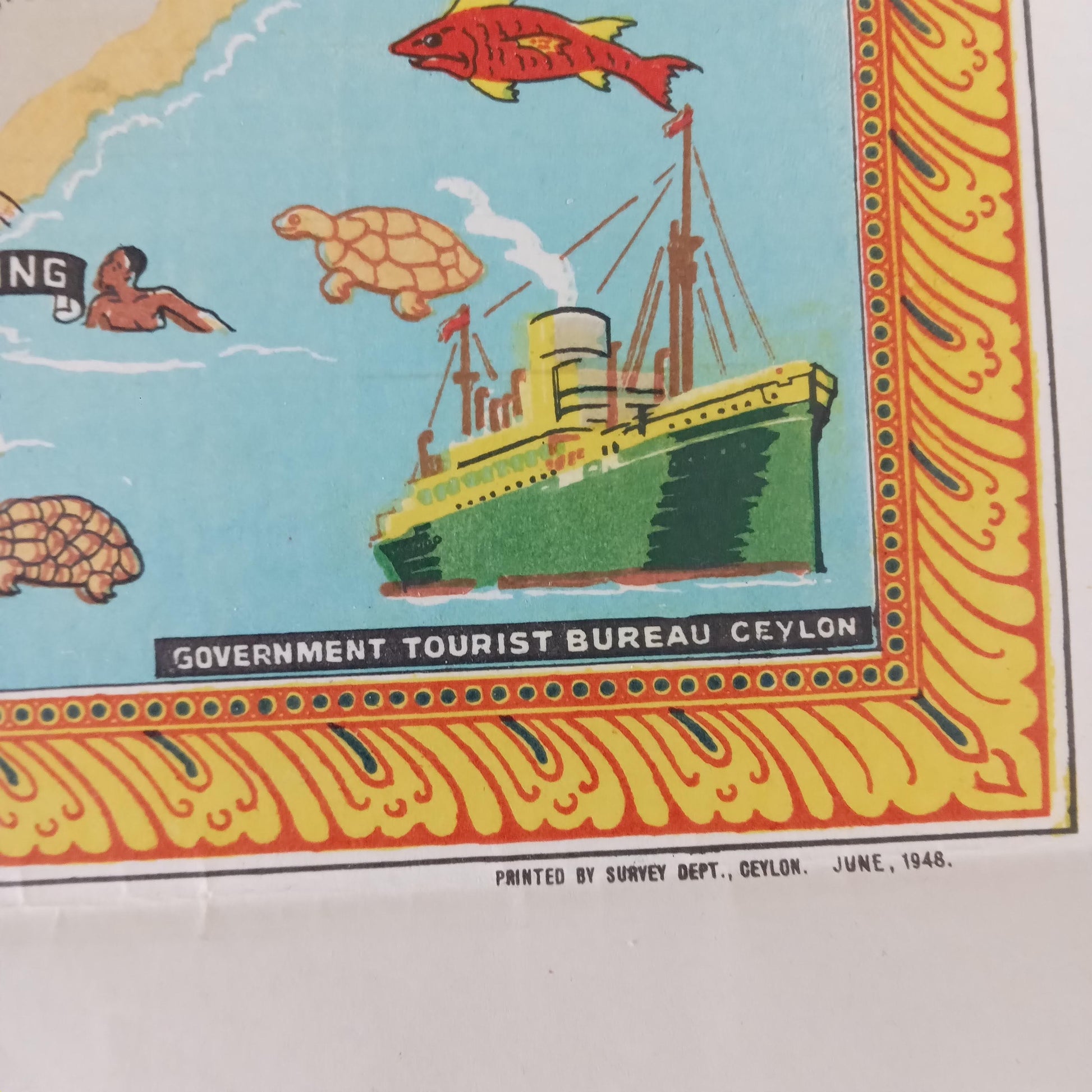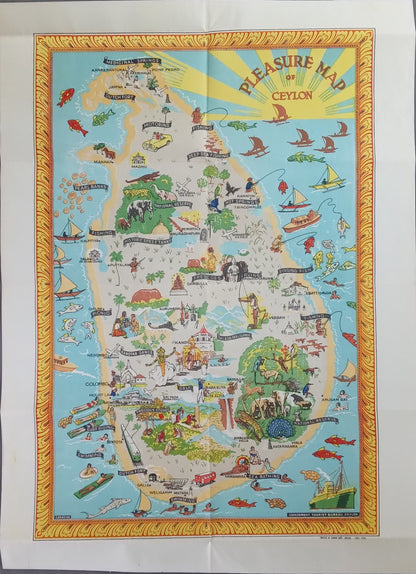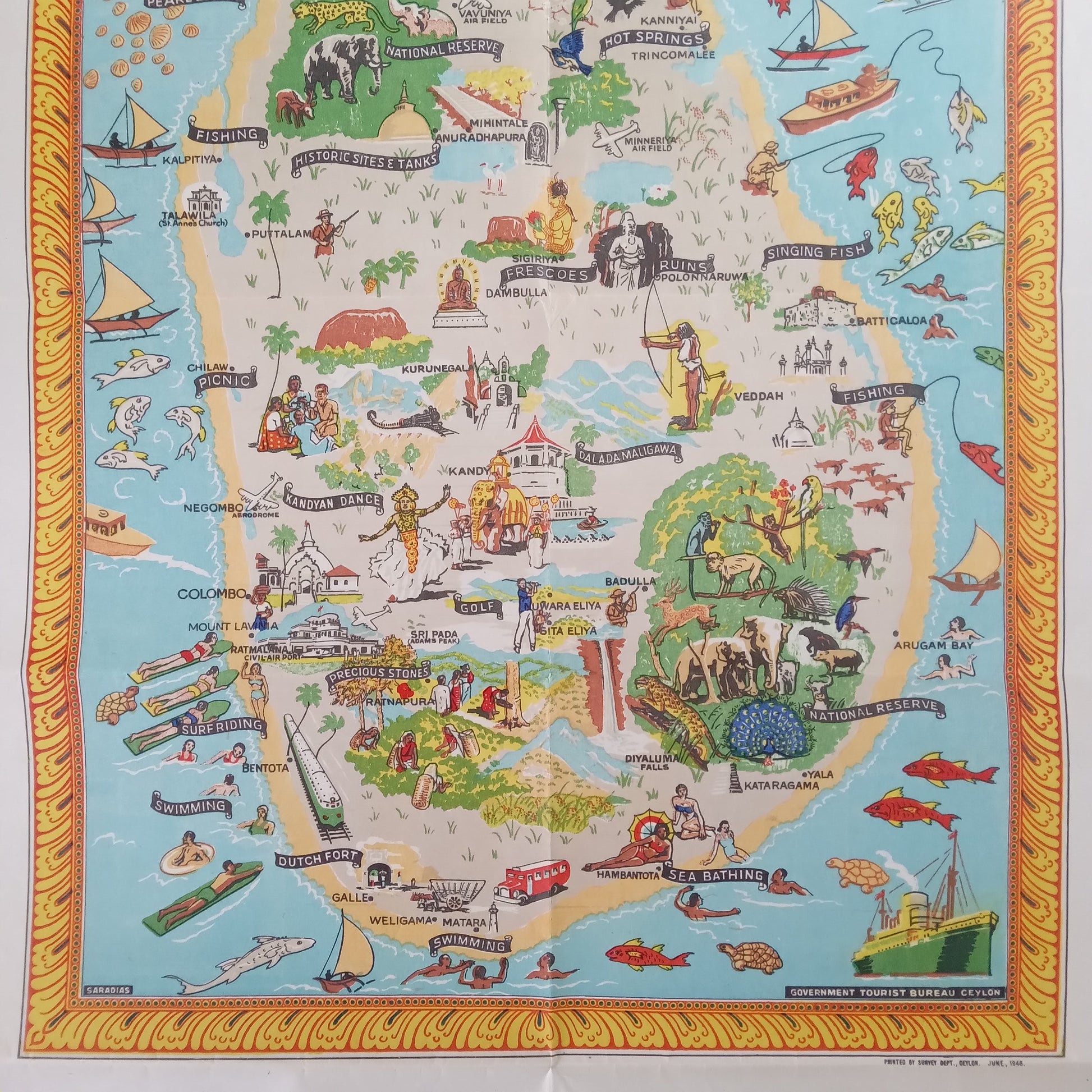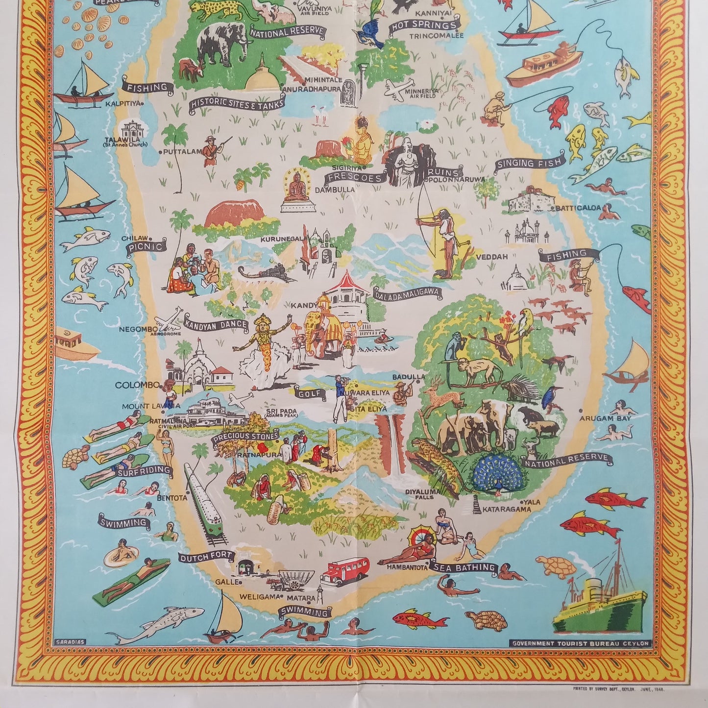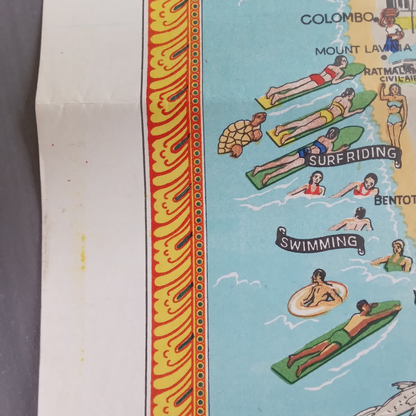 Cette "Pleasure Map of Ceylon", publiée en 1948, est une affiche touristique illustrée au format 41,5 x 57 cm. Colorée et foisonnante de détails, elle offre une représentation stylisée de l’île de Ceylan (aujourd’hui Sri Lanka), pensée pour séduire les voyageurs de l’époque. À travers une multitude de dessins vivants – scènes de vie, paysages, faune exotique, monuments emblématiques – cette carte évoque les plaisirs du voyage et les attraits culturels de l’île dans une esthétique graphique typique de l’après-guerre. Conçue comme un support de promotion touristique, elle mêle géographie, exotisme et fantaisie dans une mise en scène joyeuse du territoire.