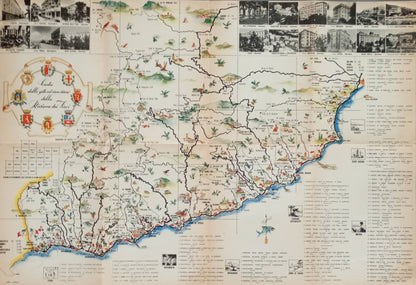 Cette carte illustrée représente la région de la Riviera dei Fiori, une portion pittoresque de la côte italienne. Elle met en valeur les principales villes et attractions touristiques de la région, avec des illustrations détaillées des paysages côtiers et des zones urbaines. La carte est ornée de photographies et de dessins qui mettent en lumière les caractéristiques architecturales et naturelles de la Riviera dei Fiori, offrant ainsi une vue à la fois informative et esthétique. La carte inclut également des informations pratiques pour les visiteurs, telles que les distances entre les villes et les sites d'intérêt, ce qui en fait un outil utile pour les touristes souhaitant explorer cette région. Les couleurs vives et les détails artistiques ajoutent à l'attrait visuel de la carte, tout en fournissant des informations géographiques précises. Dimensions : 39 cm x 56 cm.