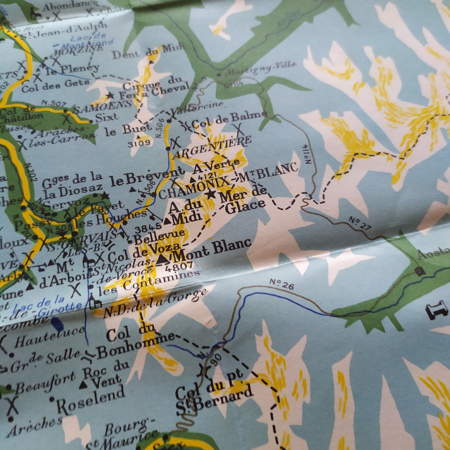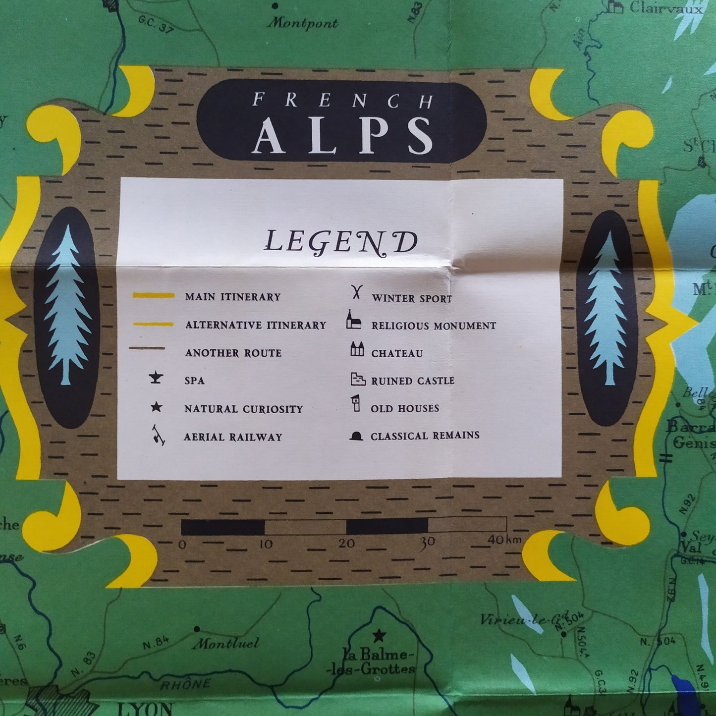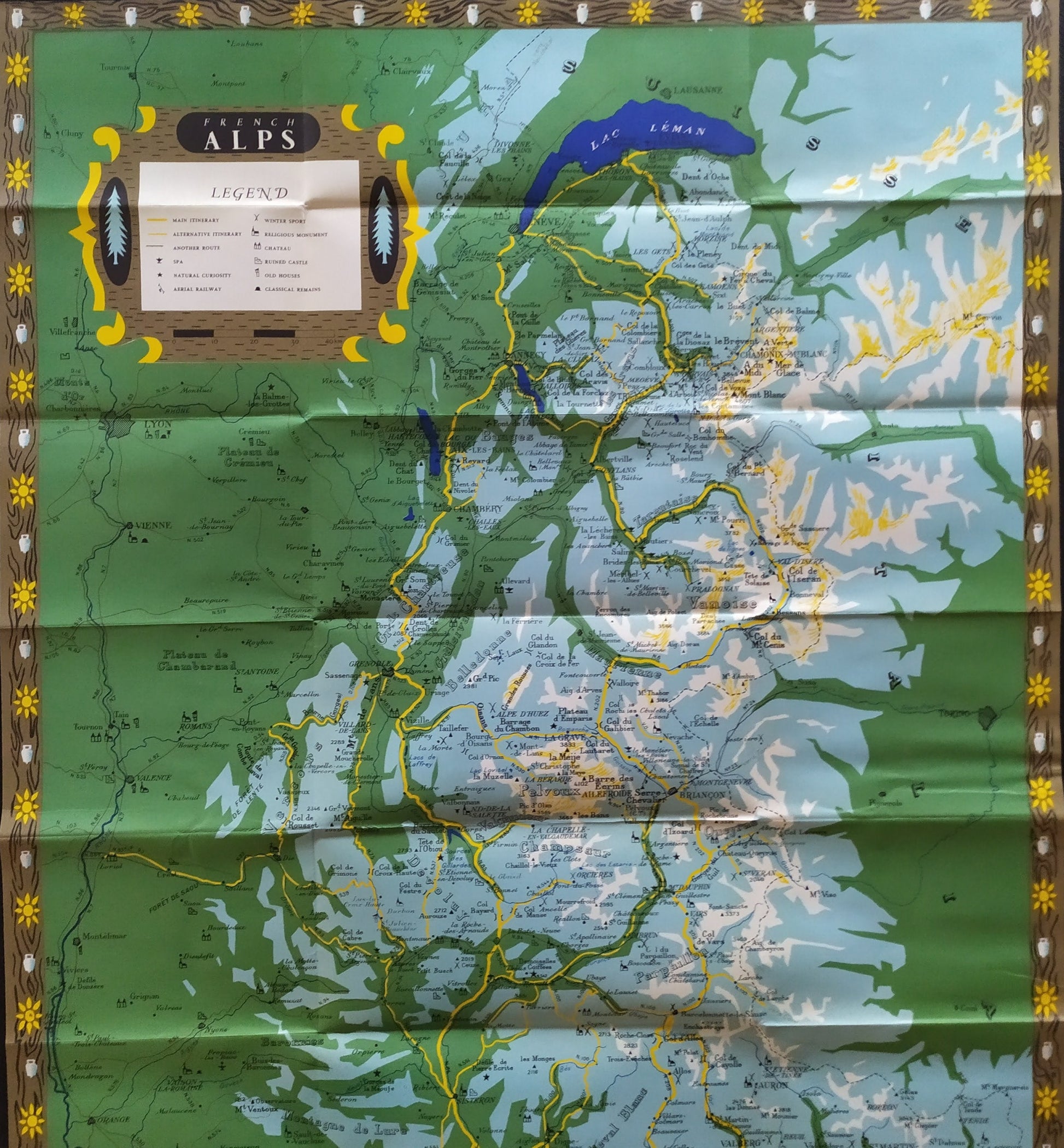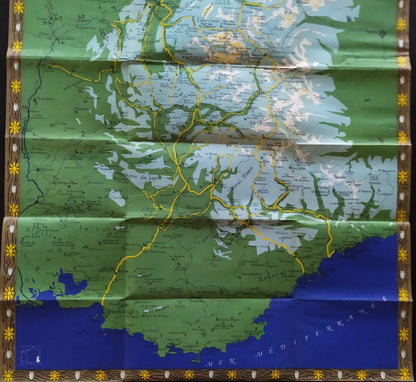Cette carte illustrée des Alpes, datant des années 1950, présente de manière stylisée les principales routes touristiques de la région alpine franco-italo-suisse. On y retrouve les grands axes routiers en jaune, les frontières nationales, ainsi qu'une représentation contrastée des massifs montagneux (en blanc et bleu clair) et des plaines (en vert). Le lac Léman est clairement visible au nord, tandis que le littoral de la mer Méditerranée apparaît au sud. Parmi les villes notables, on distingue Turin, Grenoble, Genève, Nice ou encore Lausanne. Une légende est intégrée dans un encadré décoratif en haut à gauche, indiquant notamment les routes principales, secondaires, les tunnels et les cols. La carte est encadrée d’une frise florale typique de l’époque. Dimensions : 83 x 53 cm.