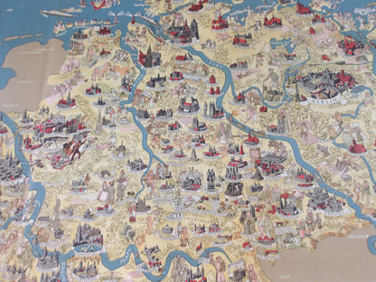 Cette carte illustrée de l'Allemagne, créée par Walter Riemer en 1936, est une représentation artistique et détaillée du pays. La carte met en valeur les principales villes, monuments et attractions touristiques à travers des illustrations soignées et des annotations. Les régions sont représentées avec des couleurs douces et des motifs qui évoquent le charme et la diversité des paysages allemands. Les rivières et les voies navigables sont clairement indiquées, offrant une vue d'ensemble géographique et culturelle. Cette carte, avec son style rétro et ses détails minutieux, est un témoignage de l'art cartographique de l'époque et invite à l'exploration des richesses de l'Allemagne. Cette carte a probablement été conçue pour promouvoir le tourisme en Allemagne, en mettant en avant les beautés naturelles et culturelles du pays. Dimensions : 60*81 cm.