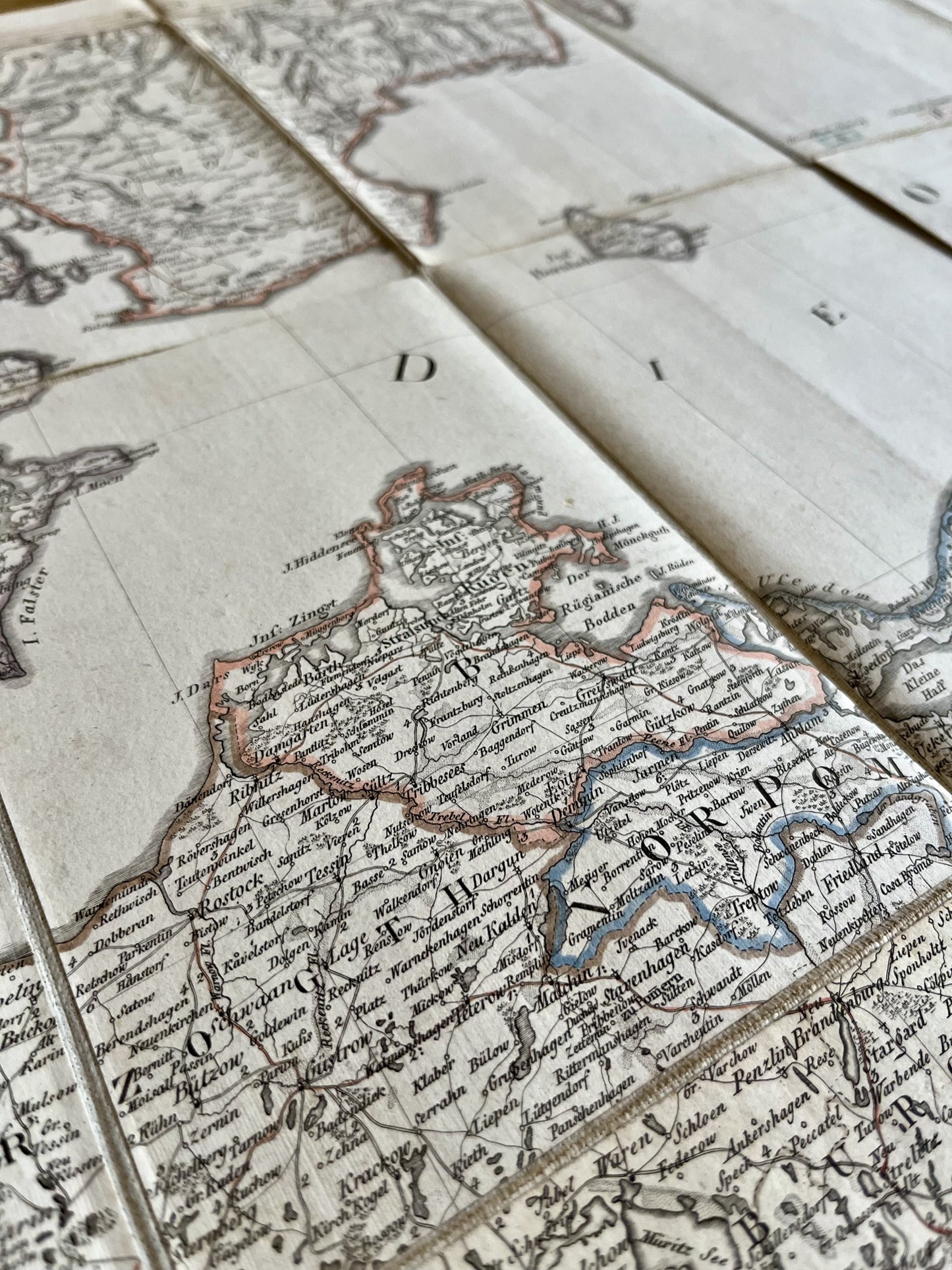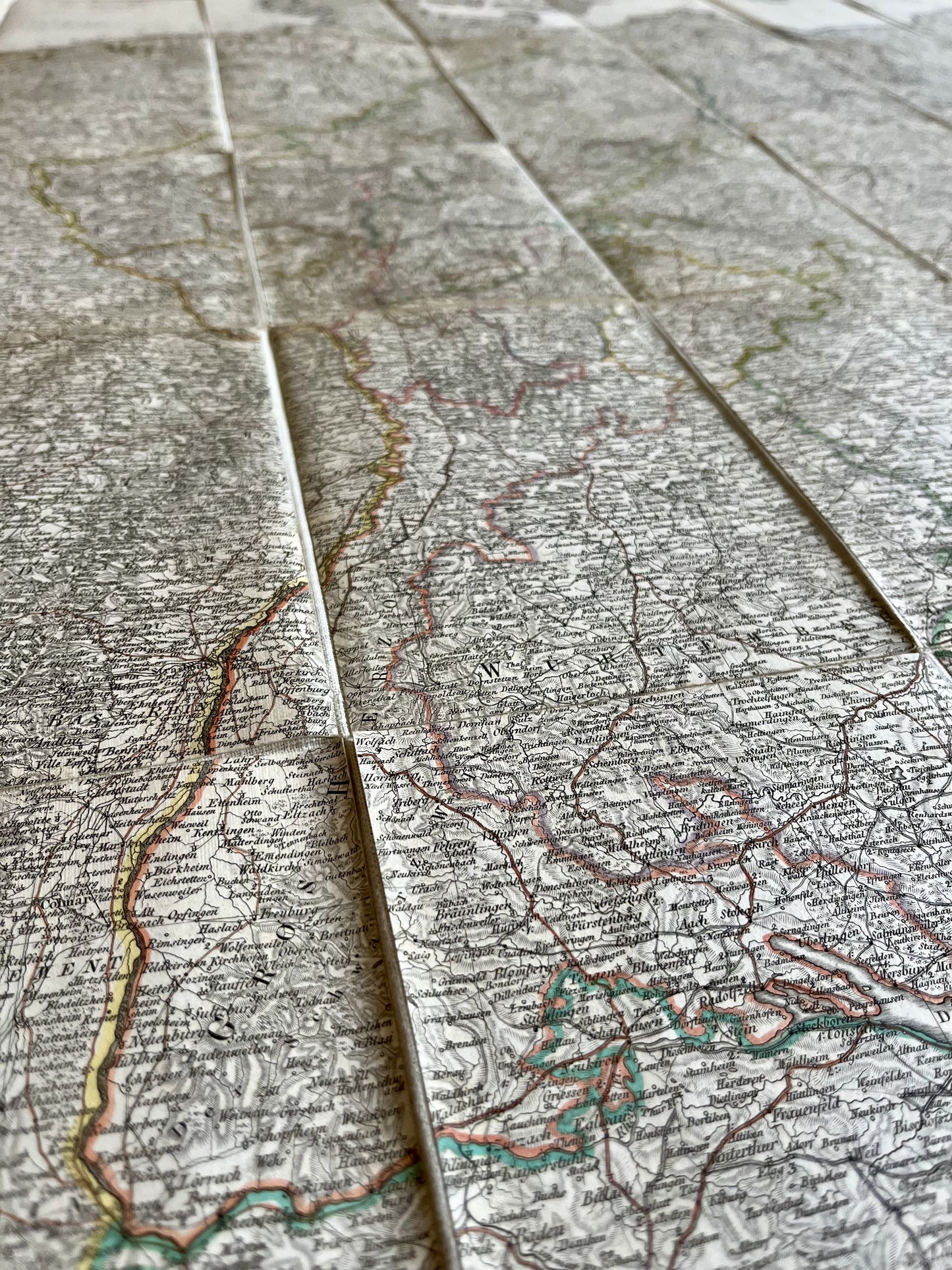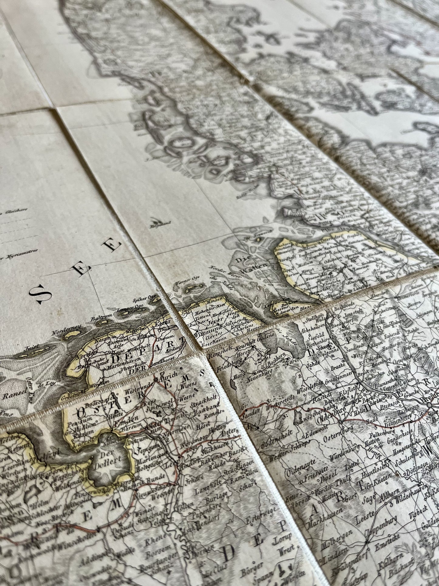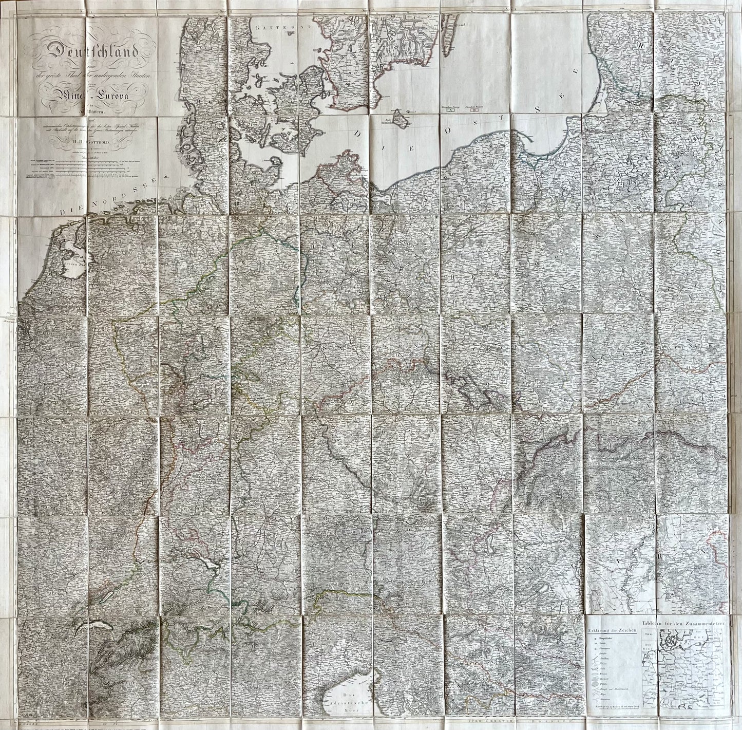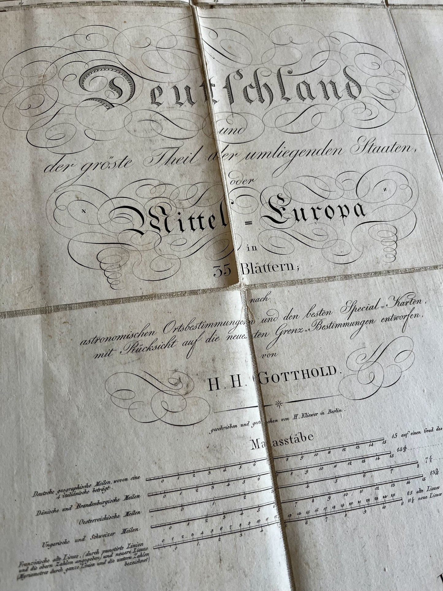 Cette grande carte entoilée représentant l'Allemagne ses pays limitrophes date de la seconde moitié du XIXe siècle. Elle a été réalisée par H.H. Gotthold et mesure 129,5x128,5cm.